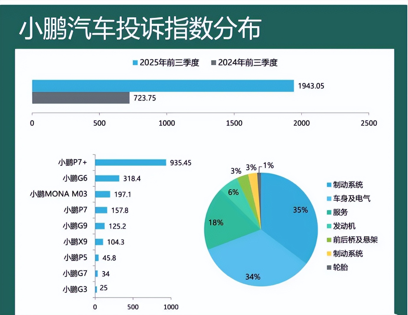 2025年前三季度主要造车新势力的投诉指数显示,小鹏汽车今年前三季度投诉指数为1943.05,同比增幅达168.47%,反映出用户投诉量的显著上升。