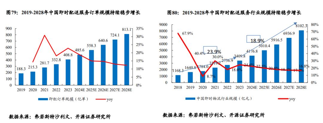 商务部发布的《即时零售行业发展报告(2024)》显示,预计2030年我国即时零售市场规模将超2万亿元。弗若斯特沙利文发布的《2024年中国即时配送行业趋势白皮书》数据显示,基于当前趋势,2030年国内即时配送市场有望突破千亿订单规模,未来6年保持年均13.1%的两位数增长。
