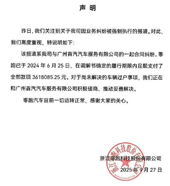 9月27日,零跑汽车对此发布声明称,公司已于2024年6月25日,在调解书确定的履行期限内足额支付了全部款项361.81万元。对于尚未解决的车辆过户事项,零跑正在和广州首汽汽车服务有限公司(下称“广州首汽”)积极磋商,推动妥善解决。