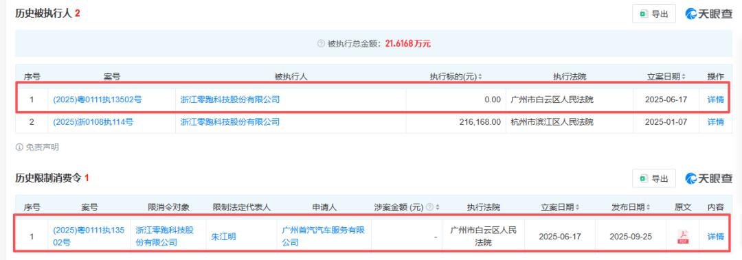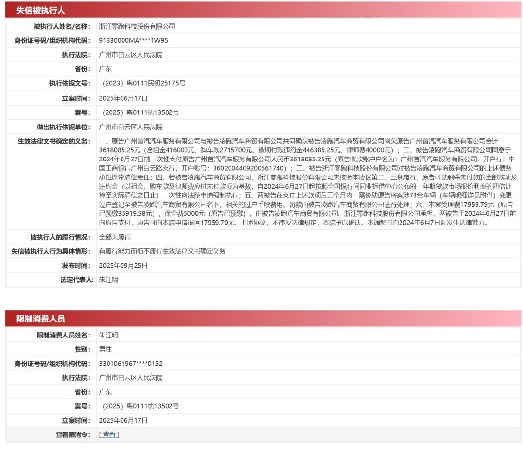 但就在同一天,广州市白云区人民发院也对零跑汽车及其法定代表人朱江明实施了限制消费措施,同时将零跑汽车列为失信被执行人。