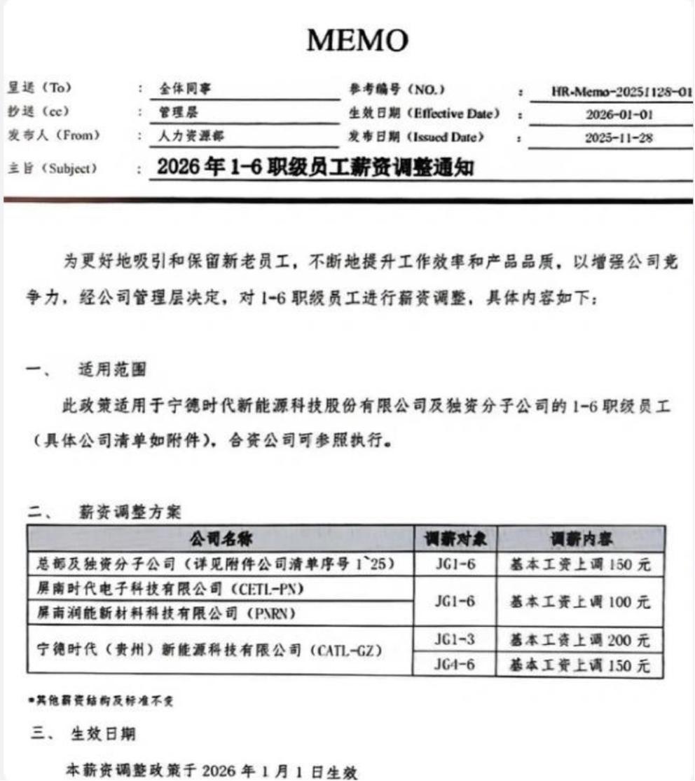 据此前网传的宁德时代薪资调整通知,为更好地吸引和保留新老员工,不断地提升工作效率和产品品质,以增强公司竞争力,经公司管理层决定,自2026年1月1日起对1-6职级员工进行薪资调整。