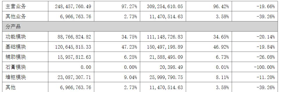 其中,功能模块收入为0.89亿元,同比下滑20.14%;基础模块收入为1.21亿元,同比下滑19.84%;辅助模块收入为0.16亿元,同比下滑26.08%;墙柜模块收入为0.23亿元,同比下滑11.2%;而石膏模块收入更是从上年同期的2.04万元直接降至0元。