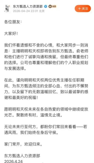 ③反思管理:他公开致歉,并承认在管理层调整后,公司管理方式出现偏差,过度侧重制度管控而忽视人文关怀,导致团队氛围出现问题。他承诺后续东方甄选将优化管理模式,平衡制度化运营与人文关怀,整改僵化、高压的管理问题。