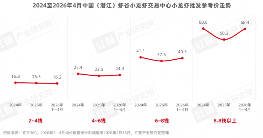 进入2026年,1月至4月小龙虾批发参考价出现阶段性回升,主要由于该时段仍处于小龙虾上市初期,市场供应量相对有限,而消费需求逐步释放,在供给偏紧的背景下带动价格短期上行。