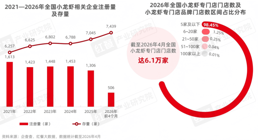 在门店数方面,小龙虾专门店数量也保持较强韧性。据红餐大数据,截至2026年4月,全国小龙虾专门店数量达到6.1万家。整体来看,当前小龙虾赛道仍以中小规模经营主体为主,连锁化程度相对较低,其中门店数在5家以下的品牌占比高达98.45%,呈现出高度分散的竞争格局。