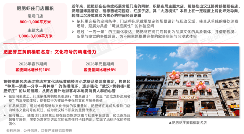 其中,肥肥虾庄正是通过大店模式持续强化空间表达能力,围绕不同消费场景打造多个主题门店。其与武汉城市地标黄鹤楼联名打造的主题门店,将城市文化符号与餐饮消费深度融合,不仅显著提升了门店的打卡属性与品牌辨识度,也使其逐步成为武汉具有代表性的城市消费地标之一,进一步强化了肥肥虾庄作为武汉城市美食名片的市场认知。