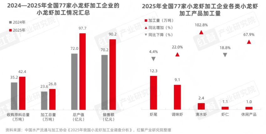 从加工的具体产品来看,2025年虾尾加工量为12.3万吨,同比下降4.42%;调味虾加工量达9.1万吨,同比增长22.0%。与此同时,清水虾增长最为显著,加工量达2.4万吨,同比增长102.8%;休闲类产品加工量为1万吨,同比增长67.9%;而虾仁加工量为1.1万吨,同比下降18.8%。
