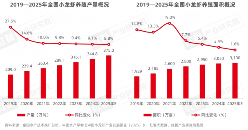 首先,在小龙虾的养殖环节,近年来,小龙虾养殖业整体保持稳步增长态势。据红餐产业研究院预估,2025年全国小龙虾养殖面积约为3,100万亩,养殖产量约为375万吨,产业规模持续扩大。