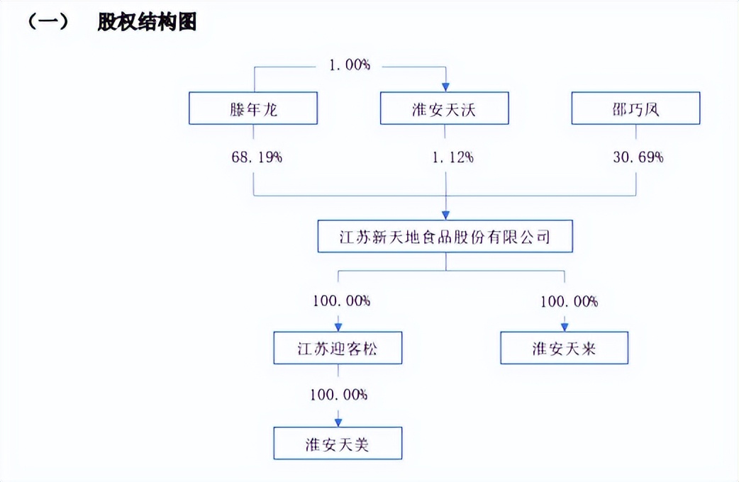 公开转让说明书透露,新天地的董事长、总经理滕年龙直接持有新天地68.19%股份,同时还通过淮安天沃企业管理合伙企业间接控制新天地1.12%股份的表决权,为公司的控股股东。其妻邵巧凤则担任公司的副董事长,直接持有新天地30.69%股份。这也意味着,滕年龙与邵巧凤夫妻就合计控制新天地100%的股权。
