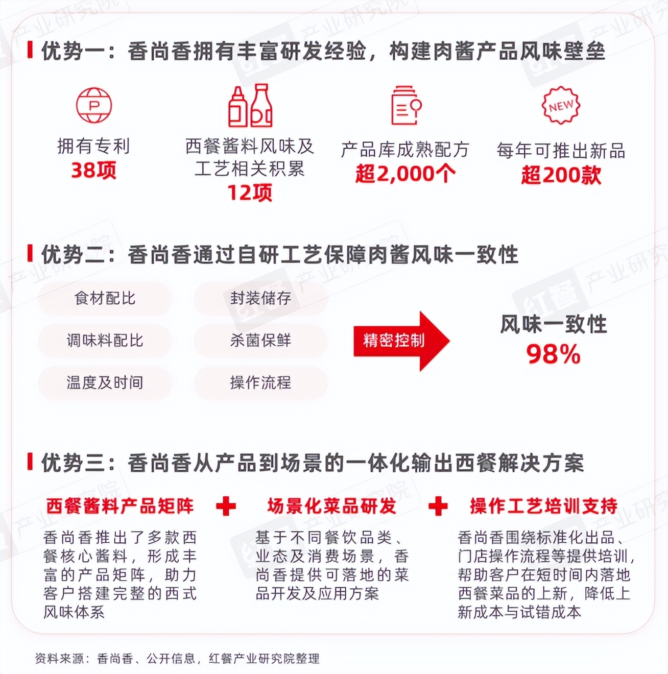 基于上述痛点,一些供应链企业积极创新并推出相应的解决方案。以在西餐酱料(尤其是意式肉酱)领域深耕超过15年的香尚香为例,其是国内较早进入西餐酱料标准化研发的企业之一,核心成员拥有20年以上西餐主厨与食品研发经验,累计服务超3,000个西餐及融合餐饮品牌,在西餐风味标准化方向具备行业领先的研发积累优势。