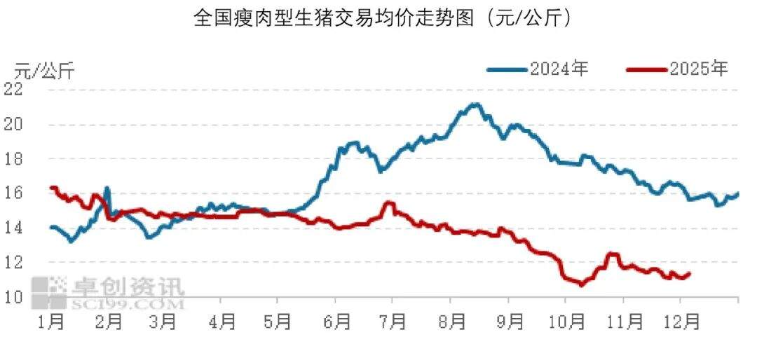 2025年11月,国内生猪价格整体呈现震荡下行走势,但月均价环比上涨。据卓创资讯监测,本月全国外三元交易均价为11.59元/公斤,环比上涨0.61%,同比跌幅30.13%。本月生猪价格震荡下行。