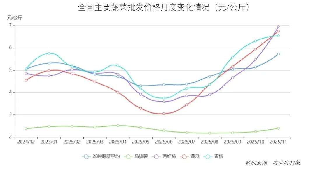 2025年11月,全国蔬菜价格呈现“高位震荡、先降后升”走势。农业农村部监测的28种蔬菜全国平均批发价格为每公斤5.72元,环比上涨11.3%,同比上涨12.4%。分品种看,25种蔬菜价格环比上涨,其中韭菜、茄子、生菜、西红柿价格涨幅较大。