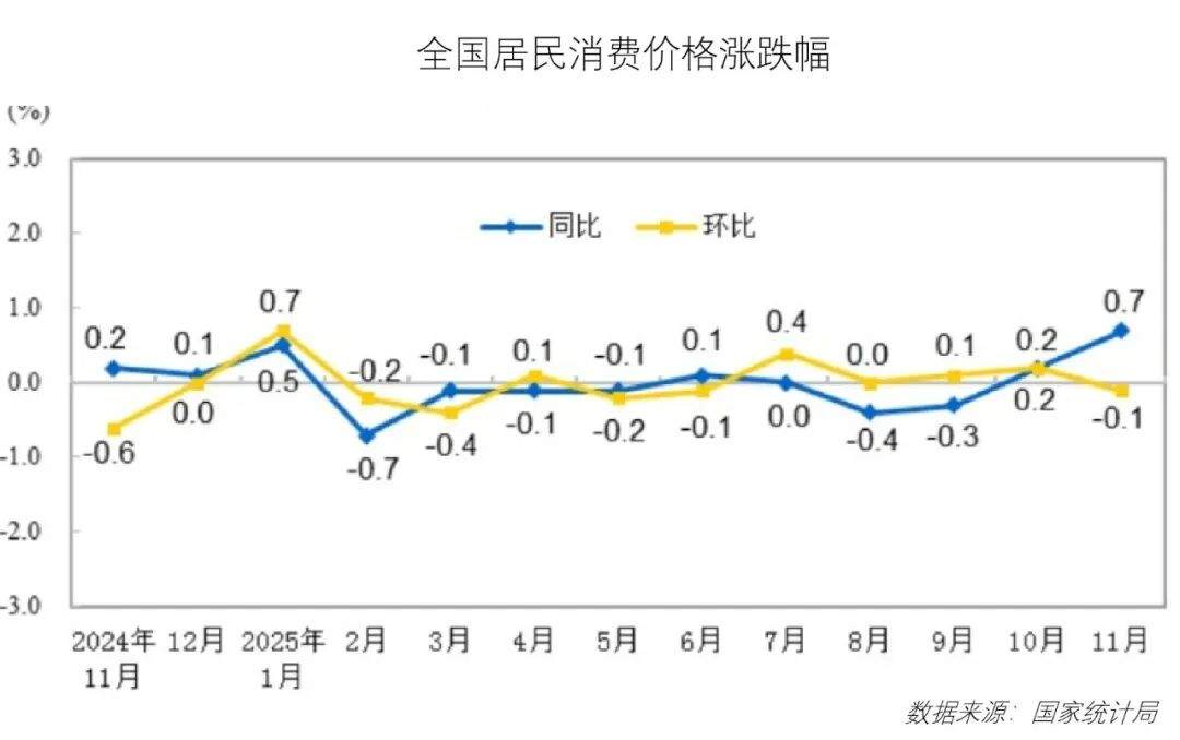 2025年11月,全国居民消费价格同比上涨0.7%,环比下降0.1%。其中,城市居民消费价格同比上涨0.7%,环比下降0.1%;农村居民消费价格同比上涨0.4%,环比持平;全国食品价格同比上涨0.2%,环比上涨0.5%。