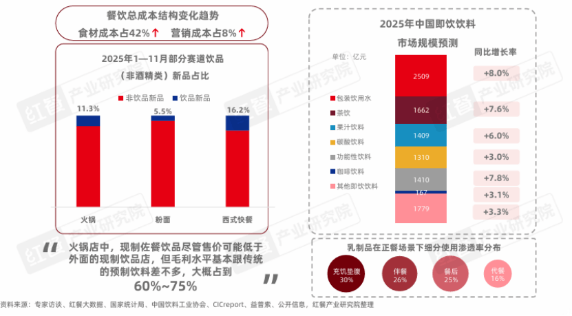 随着全国餐饮收入增速放缓,人均消费持续回落,门店利润空间被进一步压缩,我国餐饮行业步入存量竞争时代。在此背景下,佐餐饮品凭借高毛利、低改造、快速落地的特性,正从传统的餐食边缘配角转化为营收增长的引擎之一。据红餐产业研究院测算,佐餐饮品2025年市场规模接近4,000亿元,未来市场潜力还有望得到进一步释放。
