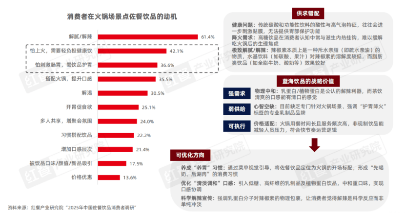 火锅场景下,消费者呈现出重口餐食下的轻负担+功能补偿需求结构:解腻/解辣、解渴等传统需求占比依旧较高,轻负担与养胃饮品的健康类需求随着消费者健康意识增加而占据第2、3名。消费者对于科学解辣和养胃的理解不足,以及现有的传统佐餐饮品(如功能类饮品、碳酸类饮品)难以系统覆盖上述健康与功能诉求,给茶饮、乳制品、植物蛋白饮料留出了进入市场的机会。