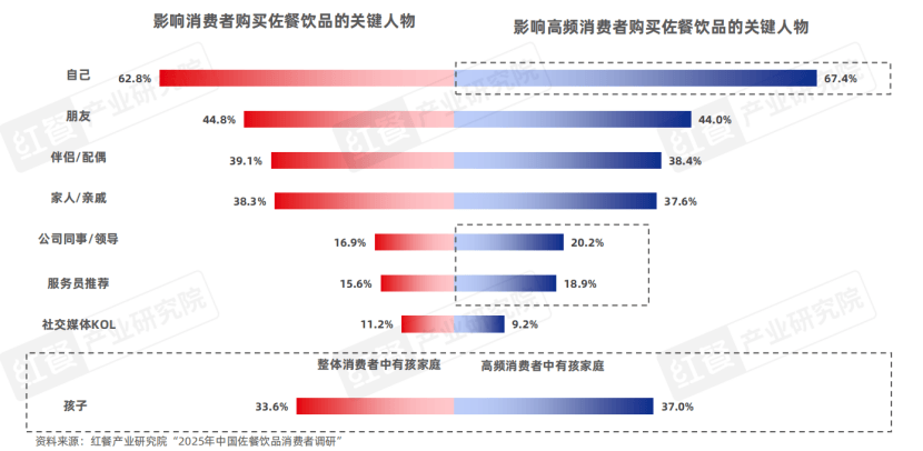 同时,在高频消费者中,公司同事/领导、服务员对购买佐餐饮品的影响程度高于整体消费者,体现出在高频次、职场化的就餐场景中,外部专业引导与商务社交对决策的干预能力明显增强。