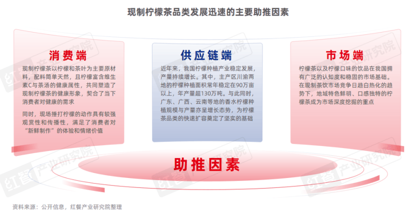 现制柠檬茶之所以保持较高的热度并实现快速发展,主要得益于消费端、供应链端和市场端三个方面的共同助推。