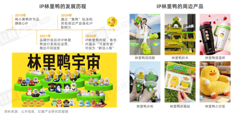 例如,LINLEE林里·手打柠檬茶从2018年开始逐渐将小黄鸭打造成品牌IP,通过持续推出不同造型、主题的小黄鸭周边,并为每只鸭子赋予专属ID卡、性格设定和故事背景,成功构建起“林里鸭”IP体系。同时,借助“集鸭”玩法、城市限定鸭鸭活动进一步强化IP影响力,使“林里鸭”成为品牌与消费者互动的重要载体。据品牌官方透露,其2025年全年送出了1.1亿只林里鸭。此外,LINLEE林里·手打柠檬茶还推出了林里鸭洞洞鞋、林里鸭积木、林里鸭保温杯、林里鸭冰箱贴等系列周边产品,深受消费者喜爱。