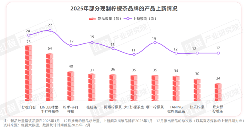 在产品创新维度,面对激烈的竞争环境,现制柠檬茶品牌积极通过产品创新提升市场竞争力。据红餐产业研究院不完全统计,LINLEE林里·手打柠檬茶、柠檬向右、柠季·手打柠檬茶等品牌在2025年推出的新品数量均在40款及以上;桂桂茶、阿爆柠檬茶、大C柠檬茶室、啊一柠檬茶等品牌则推出了30余款新品。