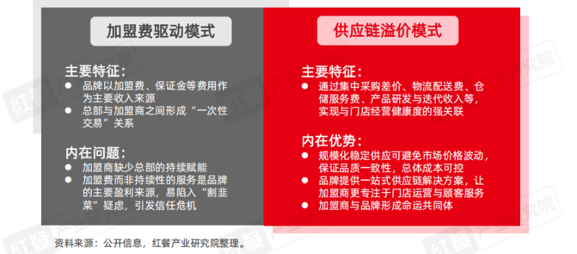 首先,品牌方盈利逻辑已从收加盟费转向供应链溢价。传统加盟费模式以一次性收费为核心,与加盟商关联弱且易存信任风险;新模式则通过集中采购、物流配送等供应链服务获利,与门店经营健康度深度绑定。