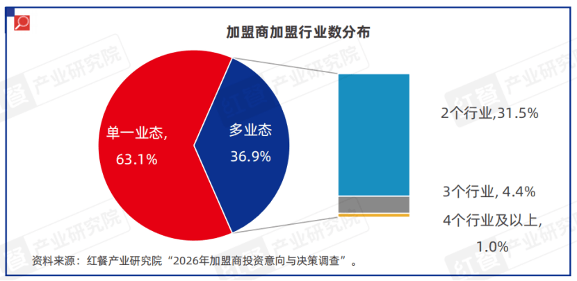 加盟行业业态布局则呈现单业态深耕的特征。据红餐产业研究院“加盟商投资意向与决策调查”,63.1%的加盟商聚焦单一行业,以深挖细分领域为核心。跨行业扩张比例则相对有限,仅36.9%的加盟商布局了多业态,其中31.5%的加盟商覆盖2个行业,涉足3个及以上行业的加盟商占比不足6%。