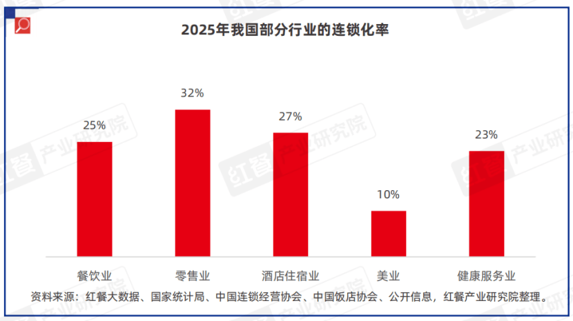 与此同时,我国各行业连锁化率呈现持续提升态势。据红餐产业研究院测算,零售业的连锁化率最高,为32%;酒店住宿业次之,达到了27%;餐饮业与健康服务业的连锁化率则分别为25%与23%;美业的连锁化率则相对较低,仅有10%。