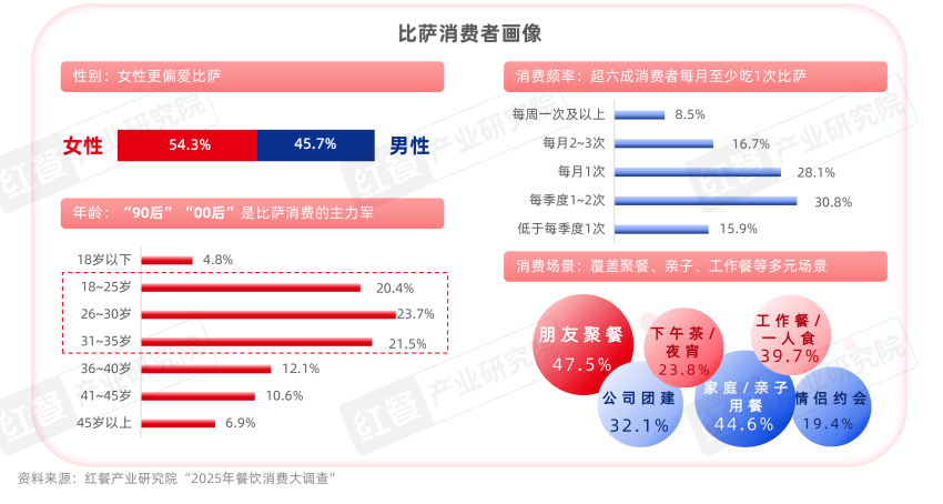 红餐产业研究院分析指出,这源于广泛的消费需求。据红餐产业研究院“2025年餐饮消费大调查”,披萨受众已覆盖00后、90后等多个年龄段,每月至少吃1次披萨的消费者占比高达53.3%;另外披萨场景适配性广,能够兼顾社交与一人食等碎片化消费场景。