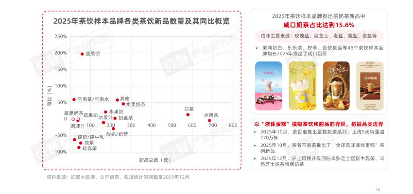 近日,红餐产业研究院发布了《茶饮品类发展报告2026》(以下简称《报告》)。报告显示,在2025年新茶饮样本品牌推出的奶茶新品中,咸口奶茶占比达到15.6%,多款产品掀起市场消费热潮。如茉莉奶白的抹茶咸乳酪系列、乐乐茶的咸法酪口味奶茶、柠季的泰式咸法酪等,均是咸口奶茶赛道的代表性产品。