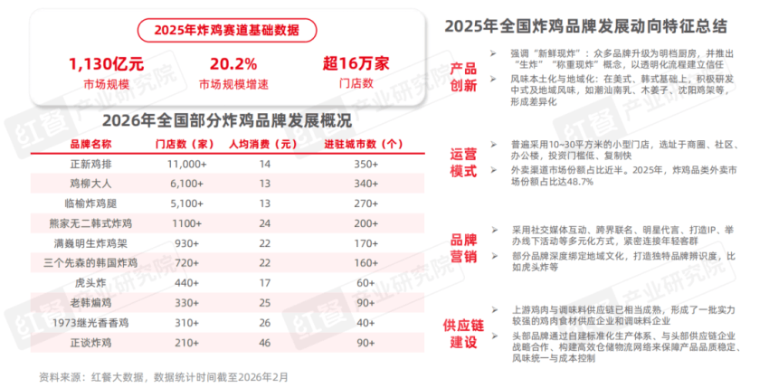 近年来,炸鸡相关话题在各大媒体平台上持续引发热议,热度居高不下。得益于易标准化、供应链成熟、投资模式轻以及地摊经济的兴起,炸鸡赛道在竞争激烈的市场中持续火热。据红餐大数据,截至2025年12月,全国炸鸡门店超16万家,2025年炸鸡品类市场规模达到1,130亿元,同比增速达到20.2%。