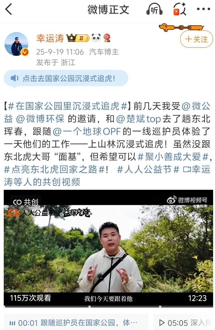 微博汽车博主@幸运涛、旅游博主@Jason和小芭蕉 走进东北虎豹国家公园,给野生东北虎当起了“保镖”,以此传递东北虎豹及其家园保护理念;微博教育博主@学霸课长 、科技博主@应旺 走进河南省洛阳市汝阳县,深度体验现代农业科技,让公益传播助力乡村发展。