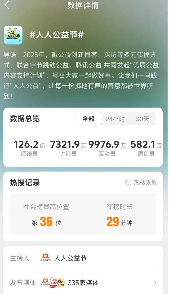 数据印证着打破壁垒,共建传播公益新生态的力量。在微博,#人人公益节#、#聚小善成大爱# 等相关公益话题新增阅读量超19亿、互动量超2200万、原创发博量超381万;视频总播放量超1.9亿,在放大中形成传播共振。
