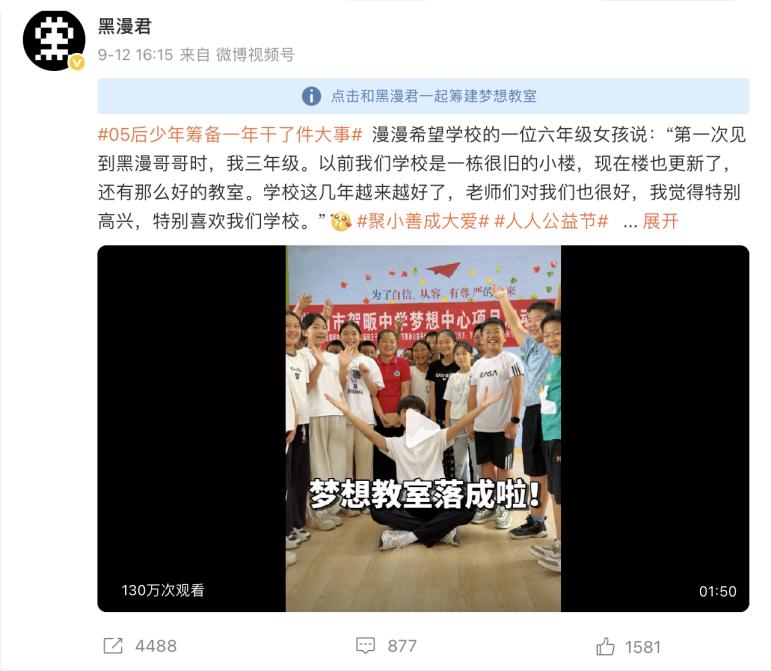05后博主@黑漫君 就是其中一个典型例子。今年9月,@黑漫君 用人生第一笔收入捐建希望小学,并筹备“梦想教室”的举动登上热搜,正是年轻一代借助数字技术传递善意、参与公益的生动例证。
