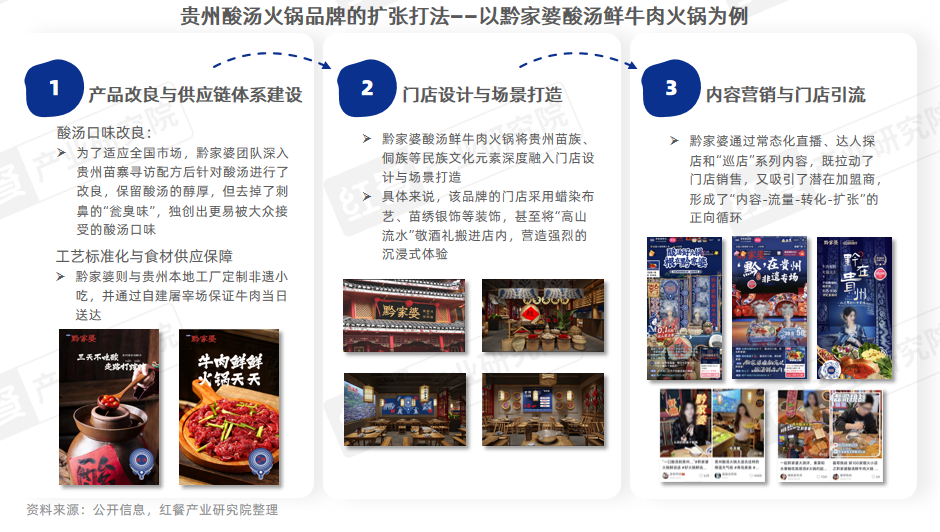 以创立于2023年的“黔家婆酸汤鲜牛肉火锅”为例,其通过产品方面的口味改良与供应链建设、沉浸式的民族特色就餐体验与常态化的内容营销这三者的协同,在竞争激烈的火锅市场中建立起可持续的差异化优势,也为贵州酸汤品类的全国化发展提供了可借鉴的路径。