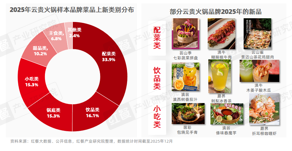 红餐产业研究院监测的10个云贵火锅样本品牌在2025年共计推出约120款新品,其中火锅配菜类占比最高(33.9%),其次为饮品类(16.1%)、小吃类(15.3%)和甜品类(10.2%)。