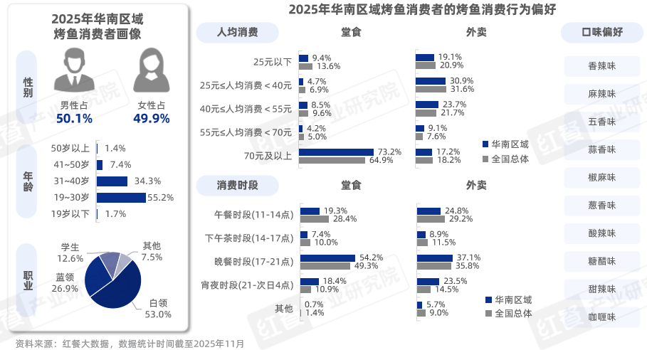 烤鱼凭借浓郁烟火气及强社交属性,近年来持续受到消费者的关注,整体呈现稳中有升的发展态势。与此同时,受饮食偏好、消费结构与竞争生态差异的影响,烤鱼在不同区域呈现出独特的发展逻辑,也进一步推动着品类向更加多元化、细分化方向演进,以适配更广泛的消费需求。