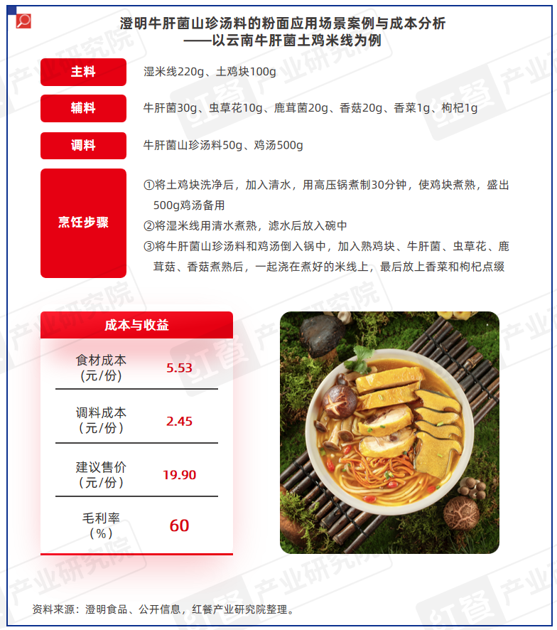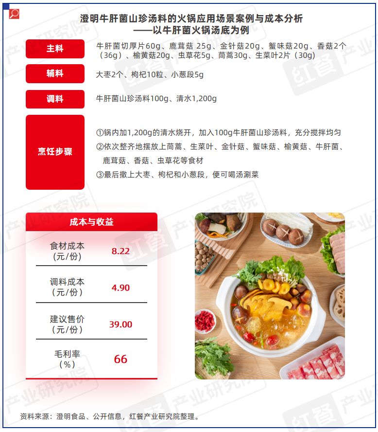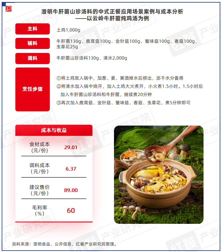 同时,澄明牛肝菌山珍汤料解决方案在成本与收益方面更具优势,食材和调料的综合成本可控制在8元左右,按建议售价19.9元/份测算,毛利率接近60%。