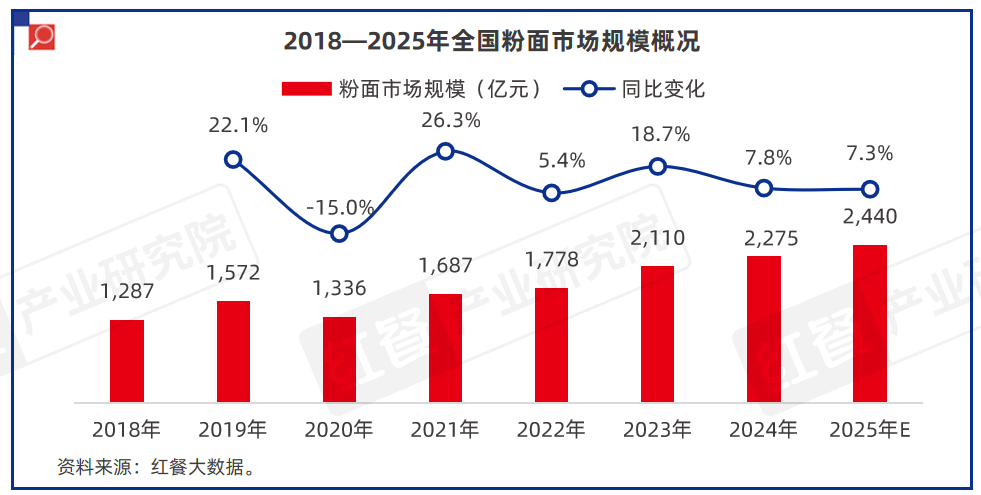 红餐大数据显示,近几年粉面市场规模呈现较高的增长态势,2024年全国粉面市场规模达到2,275亿元,同比增长7.8%,2018—2024年的年复合增长率达到10%。红餐产业研究院测算,2025年粉面赛道市场规模约为2,440亿元。
