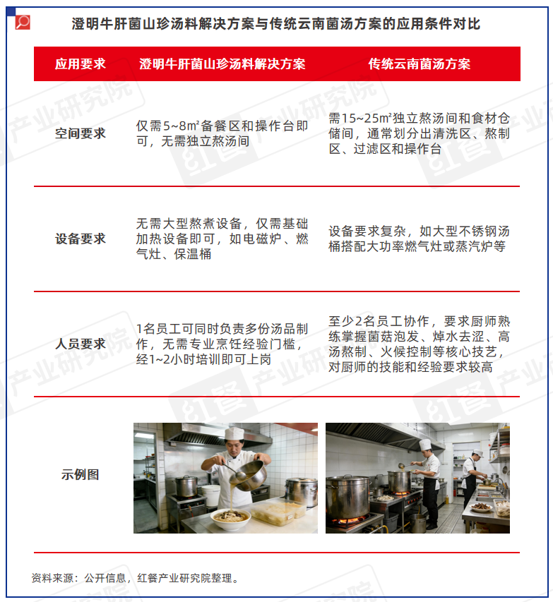 在应用条件方面,与传统云南菌汤解决方案相比,澄明牛肝菌山珍汤料解决方案也更具有优势,对空间、设备、人员等方面的要求均更为简化,有效减少了粉面门店在房租、设备购置、人力成本、培训成本等方面的投入成本。