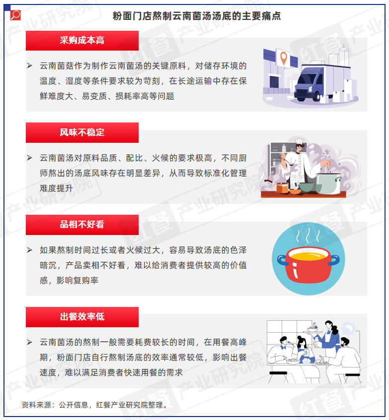 以当前热度较高的云南菌汤为例,其在研发与应用中普遍存在“采购成本高、风味不稳定、品相不好看、出餐效率低”等痛点。