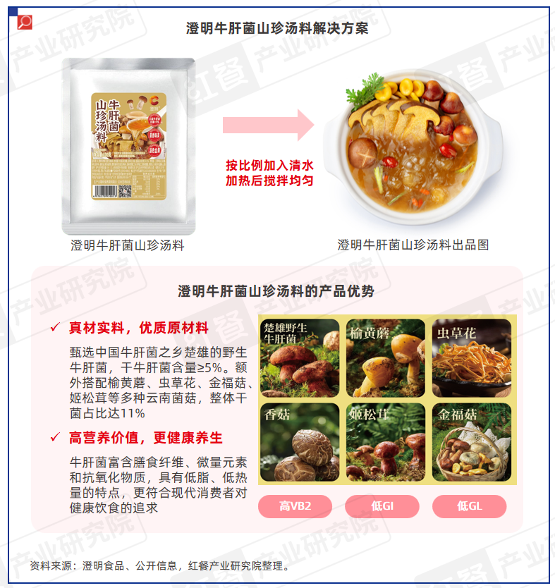 在应用场景方面,澄明牛肝菌山珍汤料可灵活适用于粉面、火锅、中式正餐等赛道,搭配各种高端食材,打造牛肝菌汤粉/面、牛肝菌锅底、牛肝菌炖鸡汤等高价值产品。
