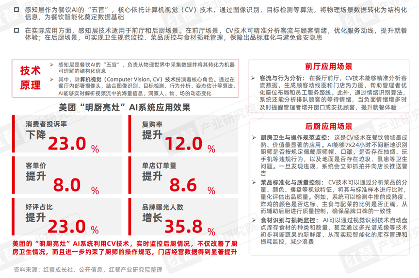 在实际应用方面,感知层技术适用于前厅和后厨场景。在前厅场景,CV技术可精准分析客流与顾客情绪,优化服务动线,提升就餐体验;在后厨场景,可实现卫生规范监控、菜品质控与食材损耗管理,保障出品标准化与避免食安隐患。