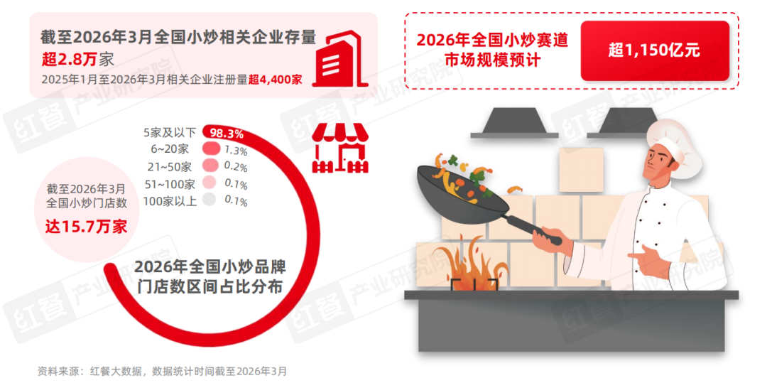 据企查查,2025年1月至2026年3月,小炒相关企业注册量超过4,400家,目前全国小炒相关企业存量达到2.8万家。门店数方面,据红餐大数据,截至2026年3月,全国小炒门店数达到15.7万家,较2025年5月增长24.7%。据红餐大数据测算,2026年小炒赛道的市场规模预计达到1,150亿元。