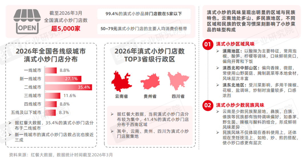 滇式小炒的风味多样且地域化明显,酸辣、鲜香、野菌风味在近年来表现尤为突出,既保留了地方特色,又符合现代消费者对鲜爽和创新口味的追求。在这一消费趋势带动下,滇式小炒逐步走出区域市场,据红餐大数据,截至2026年3月,全国滇式小炒门店数已超过5,000家,主要集中在西南和华东区域,其中云南、浙江、江苏为门店主要聚集地。值得注意的是,当前滇式小炒赛道整体仍较为分散,99.4%的品牌门店数在5家以下。