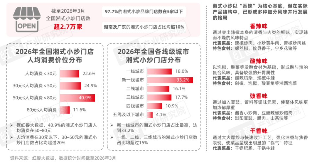 近年来,随着湘菜热度的持续走高,湘式小炒作为其中具有代表性的细分赛道之一,也在全国范围内加速扩张,整体发展势头强劲。据红餐大数据,截至2026年3月,全国湘式小炒门店数已超过2.7万家,整体规模持续扩大,但行业仍以小体量品牌为主,97.7%的品牌门店数在5家以下,呈现出高度分散的竞争格局。