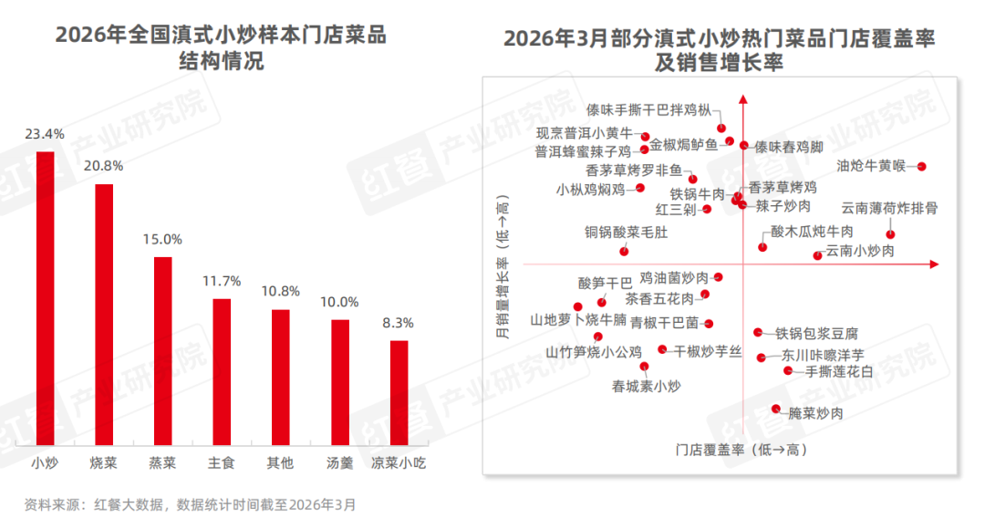 从具体菜品表现来看,随着近年来云贵菜、山野餐饮等赛道热度上升,多款滇味小炒菜品的关注度持续提升。据红餐大数据,2026年3月,傣味手撕干巴拌鸡枞、现烹普洱小黄牛、傣味舂鸡脚、油炝牛黄喉等菜品的月销量增长率均高于整体水平。