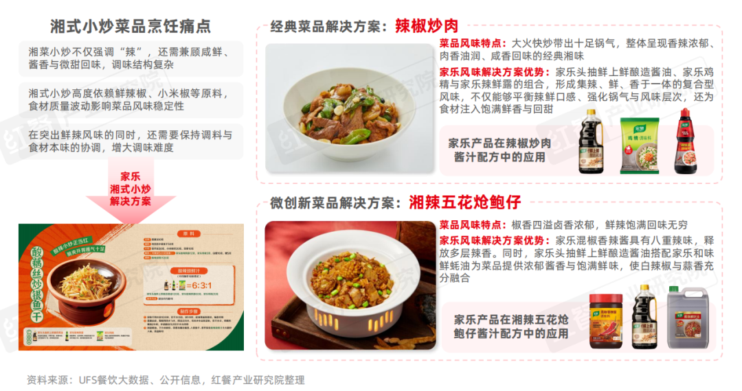 面对湘式小炒在鲜辣、咸鲜、酱香和微甜回味等多层次调味上存在的稳定性和协调性难题,家乐凭借专业厨师团队和标准化调味体系,为餐饮门店提供可复制的湘式小炒解决方案,既保证菜品风味稳定,又提升出品效率和口感一致性。