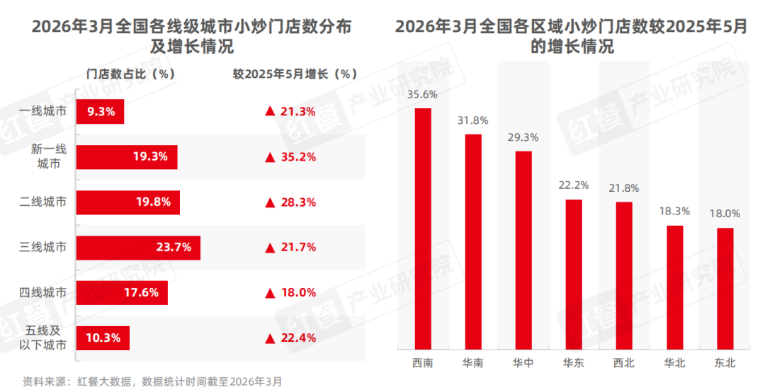 区域分布方面,与2025年5月相比,西南、华南和华中地区的小炒门店数增长较快,增幅分别达到35.6%、31.8%和29.3%。
