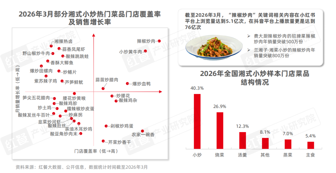 从菜品结构来看,湘式小炒门店除小炒菜品外,通常还搭配烧菜、汤羹、蒸菜及主食等品类,但整体仍以小炒为核心,小炒类菜品在菜单中的占比达到40.3%。不少湘式小炒菜品拥有较高的市场热度,2026年3月辣椒炒肉、小炒黄牛肉、山野椒炒牛肉等菜品月销量增长率相对较高。其中,辣椒炒肉凭借着较高的门店覆盖率和销量增长率,成为湘菜小炒中的明星产品。