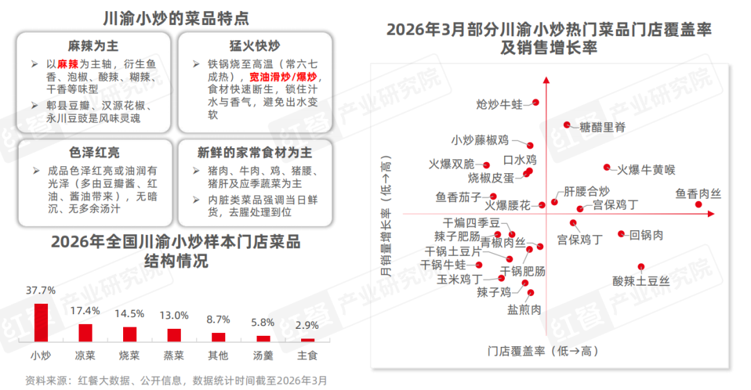 在此基础上,川渝小炒门店的菜单结构也呈现出“以小炒菜品为核心、多类菜品协同”的特征。小炒菜品的占比达到37.7%,凉菜、烧菜、蒸菜等类型在川渝小炒样本门店的菜单结构中均占有一席之地,且这些菜品多为经典川菜,如毛血旺、酸菜鱼、凉拌折耳根等。热门菜品方面,2026年3月,炝炒牛蛙、小炒藤椒鸡、糖醋里脊、火爆牛黄喉等菜品月销量增长率高于整体水平。
