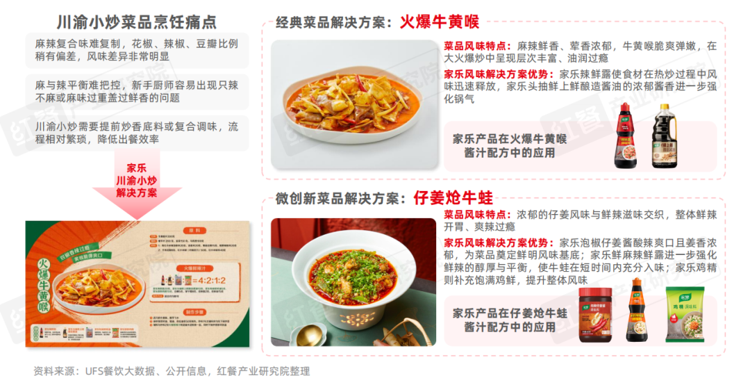 在这样的背景下,家乐针对川渝小炒的麻辣平衡与复杂烹饪流程,提供标准化复合底料及调味方案,使门店无需依赖过多手工操作即可精准还原麻、辣、鲜的风味,同时简化操作步骤,提高出餐速度和口味稳定性,降低新手厨师的上手难度。